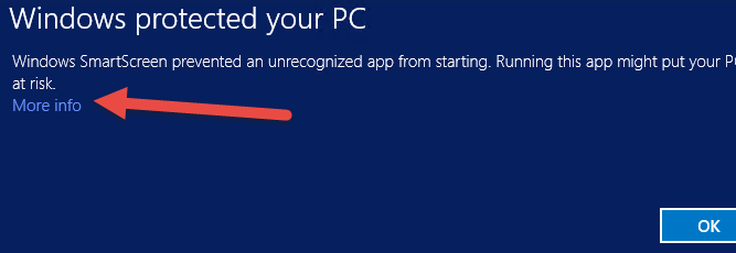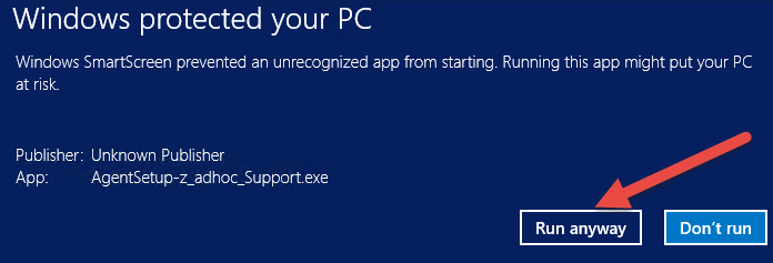 Launch the AgentSetup file by double clicking on it. You may see the following warning dialog or similar. Please click on More Info if you do:
